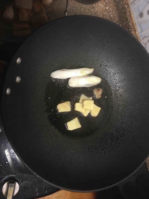 利用国内余油,将葱段姜片煸香,放入肉块!