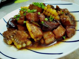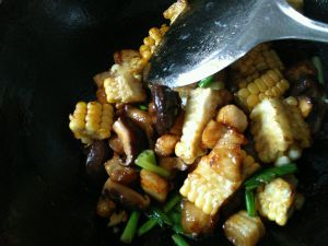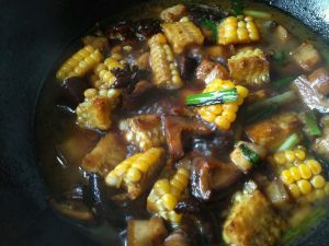 放玉米和切好的香菇,放盐调味料酒去腥老抽上色生抽提鲜。加水跟肉齐平,中火炖到肉糯糯的就大火收汁