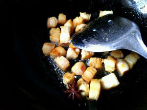 热锅,放一丁点油,桂皮(我用半截小拇指大) 茴香几粒扁一下,香气出来后放肉,炒几下