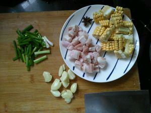 准备材料,五花肉切两厘米方小块,玉米切块,葱蒜拍碎