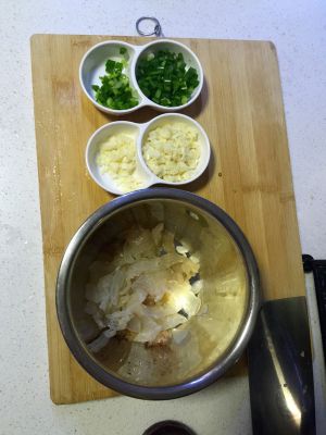海蜇头浸泡3-4小时后捞出,放温的开水冲一遍后改刀(不改也可以)。蒜瓣切末,红甜椒切丝(忘记买红椒了用了青辣椒暂代)后放小碗里,加生抽一匙、陈醋两匙、白糖少量、麻油一匙拌成蒜泥汁待用。