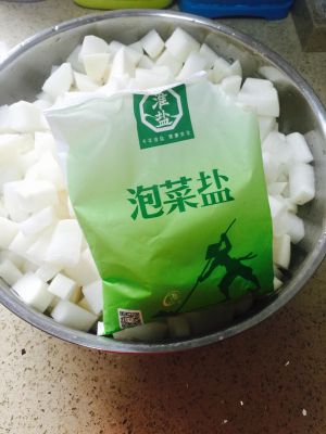这是切好以后的样子,放入盆中,开始加盐腌制。我用的是专门腌制泡菜的粗盐,很好用,超市都有卖。腌制时间为2-3小时,腌制期间要翻动一下。用手捏一下萝卜,变软,出水即可。