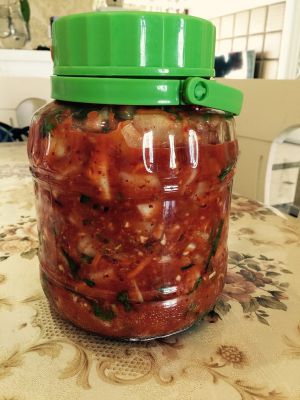 装入泡菜罐中密封。冬季可以放室温中发酵1-2天后放入冰箱冷藏保存,7天后可以开封。夏季在室温中发酵一天放入冰箱。