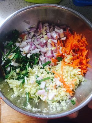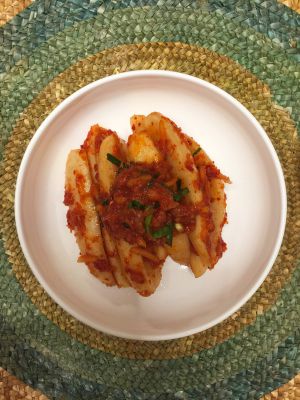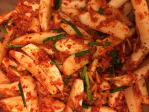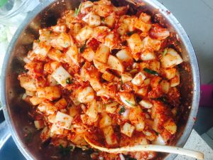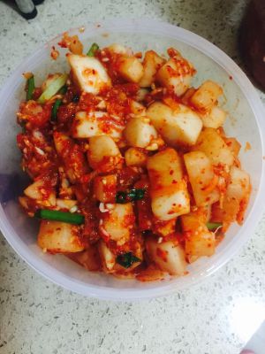 糯米糊冷却后,开始混合所有配料调料。除韭菜洋葱外,将所有配料加入萝卜丁中,然后加入3勺鱼露,3勺虾酱,韩国辣椒面混合均匀。戴上一次性手套搅拌片刻,最后加入韭菜和洋葱,混合均匀。