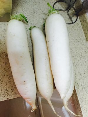 我是喜欢吃黄瓜,所以就放了两根,其实这个很随意,看你自己喜欢。然后分别把胡萝卜和白萝卜切成条,最好不要太厚太大。均匀一点。