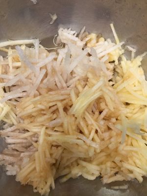 把准备好的糊糊和切丝的韭菜,苹果梨丝加入搅拌。加入鱼露,糖。根据口味加入虾酱或者虾皮粉,调味。