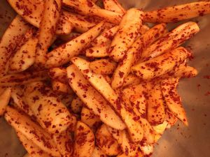 带食品手套,把沥干水分的萝卜用辣椒面搅拌均匀