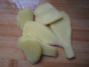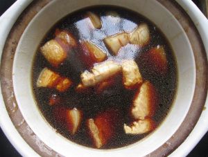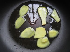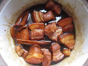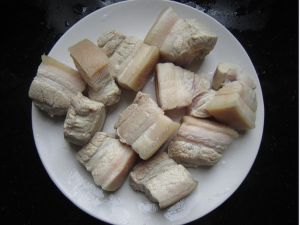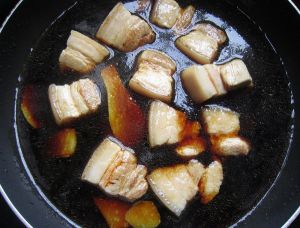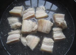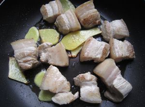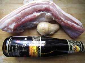 起油锅放生姜片,放五花肉翻炒微炸出油,烹入料酒,加酱油加热水,水未过肉块为宜,煮开转小火焖20分钟.,加盐