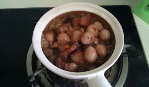 20分钟后加入鹌鹑蛋,倒砂锅煲小火煨10分钟,关火前加味精及少量白糖。
