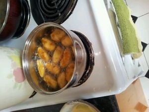 中火炸4分钟,用筷子夹感觉到表面变硬就可以捞出