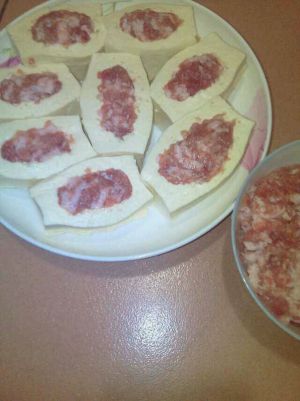 轻轻的把豆腐中间掏掉一点不要,把肉馅塞进去,小心点一定要温柔一点,肉馅要一点一点塞,豆腐才不会破