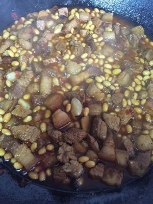 然后放入姜蒜,豆瓣,老抽,料酒,香料炒出香味,放入黄豆,放入开水,