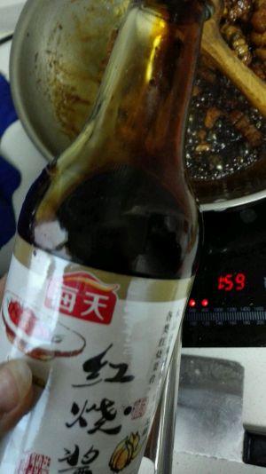 加入少许红烧酱油,翻炒均匀放入调料盒。倒入开水加盖大火闷煮。