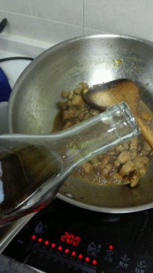 炒色均匀后加入料酒。