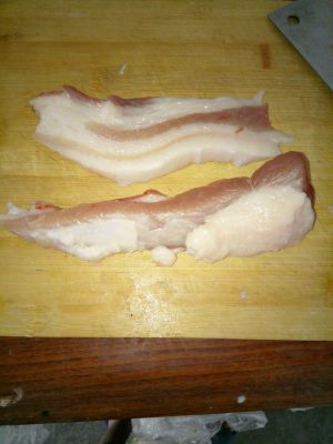 切成块儿!由于天儿太热了!等到我做的时候有点味道!我加了点料酒!在切肉的时候大家就可以烧水咯!