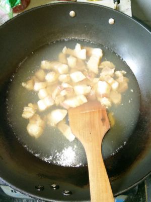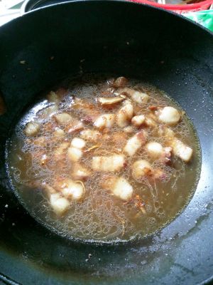 将油小火放入糖炒化(最好是炒出泡泡)放入五花肉上色