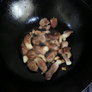 锅中放油烧热,将切好的前腿肉放入油锅中煎炒片刻,等到肥肉出油,瘦肉变色外表有些金黄后取出。