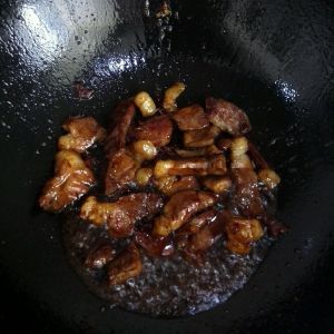冰糖融化了,颜色变黄时加入生姜,一小块桂皮,两粒八角,几粒花椒,这时冰糖的颜色已经发红,起泡,快速倒入刚才炒过的猪肉翻炒。