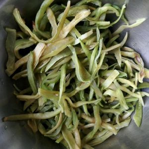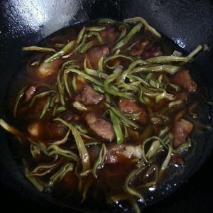 将豆角干放入锅里和肉一起翻炒,加水烧开。