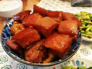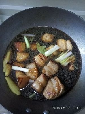 选用优质5层的好五花肉,焯水,炒出油后乘出,冷油下锅加冰糖炒融后下五花肉上糖色均匀,加入蘸油,加水烧至肉变软