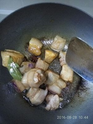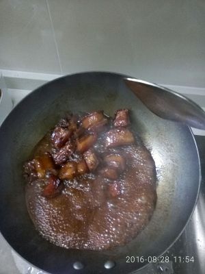 锅里放少许油,七成热时放入白糖,待白糖呈焦糖色,加入五花肉翻炒
