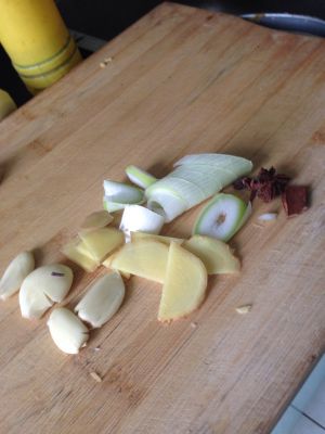 五花肉分肥瘦分好,这次没买到五花肉,买的猪前胛,总之要带肥带瘦的肉。生姜切片,大拇指这么大的生姜片三四片差不多了,葱两三根,长度1寸2寸没考究的,爸爸切的一寸左右。之前没拍图,我找了个差不多的放上来。