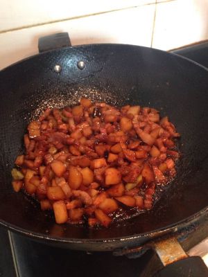 炒糖色,依次加入调味料,肉丁,加入适量盐,放点土豆丁也行,放入老抽生抽,最后加入水漫过肉,炖至土豆绵软,肉也绵软,