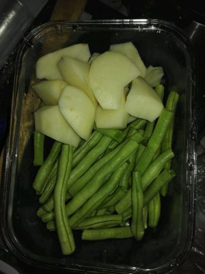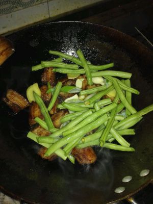 放豆角土豆炒,加盐,生抽,放水炖到水收完