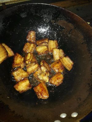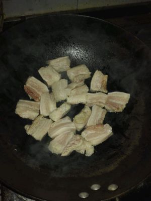 肉耗猪油,这样不腻,猪油取出放着以后用,取出肉,换成食用油,凉油放冰糖四粒,不停搅拌,一直到糖变成红沫沫,下肉