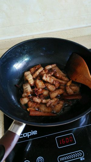 锅内加入两汤匙食用油烧热加入冰糖炒至暗红色加入五花肉翻炒一下加入温水,葱姜八角香叶大火烧开改小火炖四十分钟然后加入蜜桃再炖至五分钟出锅。