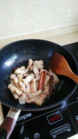 起锅不用加油,五花肉倒入锅中煸炒出油(如果锅底易粘,可加少许油)。