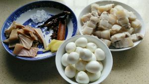 准备所有材料:五花肉焯水,冲洗干净。鹌鹑蛋煮熟剥壳备用。家里有半块泡好的尤鱼也准备放进去。