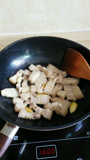 锅里不放油,直接放五花肉和生姜中火干煎,让肉慢慢出油。