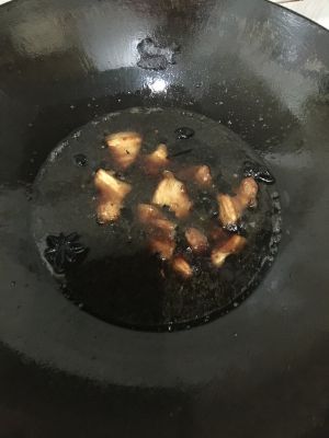 1.锅烧热倒入少许的油,加入姜片煸炒出香味。倒入五花肉煸炒均匀。 2.煸炒之五花肉两面微黄。 3.加入适量的黄酒煸炒,在加少许的酱油翻炒均匀。 4倒入可乐,加入八角和桂皮盖上锅盖煮只沸腾。