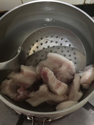 将五花肉切块 放入锅中用水煮开 肉汤不要倒掉 后面有用