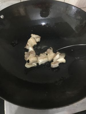 倒入五花肉炒至变色 倒入料酒 老抽炒至变色