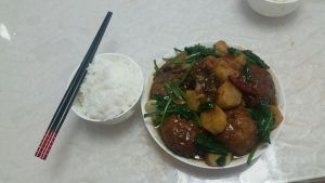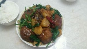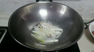 葱丝倒在丸子上,山药切段,炸至金黄,放丸子边上