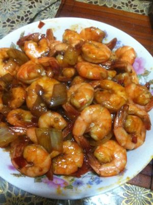 热油,放入洋葱头,豆瓣酱,爆香,放入腌制好的虾,这时候盐可放可不放,根据自己的喜好吧,等到虾子变色,出锅。