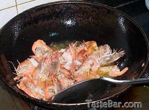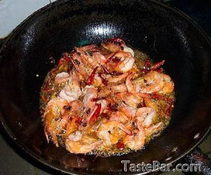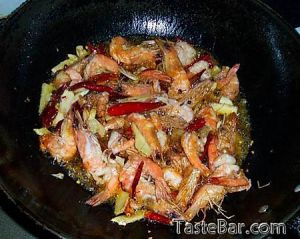 锅内放小半锅油、非常热时,下入虾大火爆至外表发白,用漏勺捞起备用
