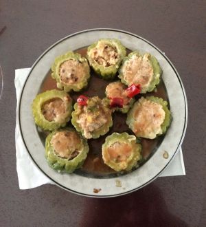 成品摆盘。(如果不想吃油炸的,把肉馅放进苦瓜里面,然后上锅蒸大火15分钟即可)