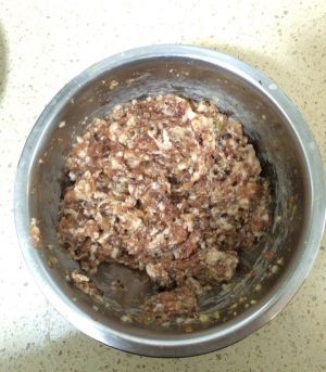 肉馅儿加料酒、生抽、五香粉、香菇丁,一个方向搅匀、上劲儿!
