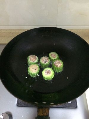 将肉馅塞满苦瓜,两端用湿淀粉封住,锅里放少许油,两头略煎一下,一头煎约1分钟。