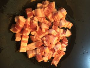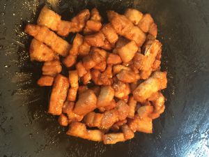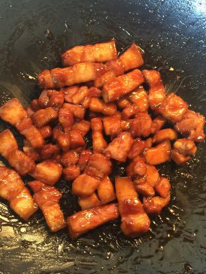 锅加热倒油放几块冰糖,熬化开放入提前切好的五花肉块翻炒,上色。放入辣椒,八角,桂皮,花椒炒上一会