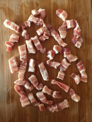肉洗净,然后放在锅里加水煮,煮开之后捞起来沥干水分,然后切成大小均匀的小块儿备用