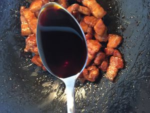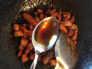 倒入焯好的肉块,翻炒,在将葱姜加入翻炒匀。添酱油,少许耗油,在翻炒几下。