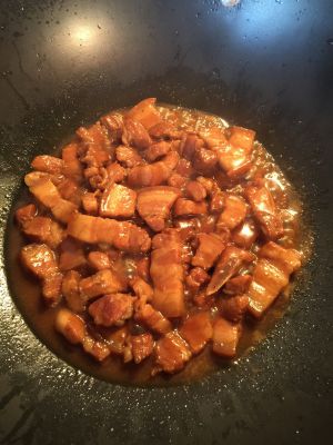 锅烧热,倒入适量的油,待烧热后加入两匙白糖,熬成汁后倒入切好的肉,然后加入姜翻炒,待两面炸至微黄的时候加入酱油,料酒,翻炒均匀后加水没过肉,开大火煮,煮开之后小火焖