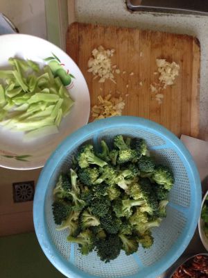 备菜:蒜切片、红辣椒切丝、火腿肠切片、胡萝卜切条、西兰花从茎部切成小朵(泡在淡盐水中洗净)