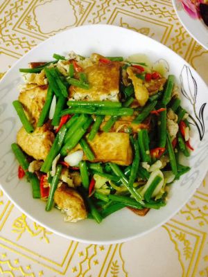 放蒜炝锅,后加入猪肉翻炒,变色后放酱油、五香粉翻炒,加入豆腐条翻炒,加水中火小炖。