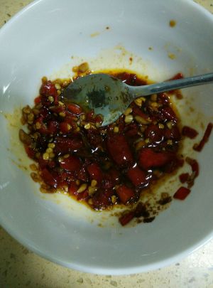准备佐料剁椒酱、盐、鸡精、醋、辣椒油放一起调匀(味道的关键之处)