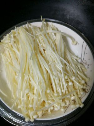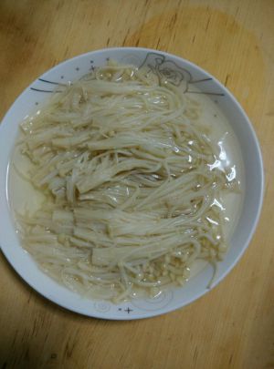 金针菇去蒂洗净,加入已烧开的水中煮3分钟,捞出,用凉开水冲冼,沥干备用。